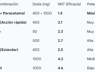 Curiosamente, cuando hablamos de dolor agudo (un dolor de muelas o un esguince), la revisión de Cochrane¹ revela un dato sorprendente: la combinación de Ibuprofeno + Paracetamol es más potente que casi cualquier AINE por separado. Esta sinergia permite alcanzar un "Número Necesario para Tratar" (NNT) muy bajo, lo que significa que es extremadamente fiable¹.