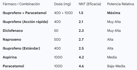 Esta tabla utiliza el NNT (Número Necesario para Tratar). Cuanto más bajo es el número, más potente y efectivo es el fármaco para lograr un alivio del 50%.