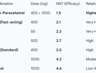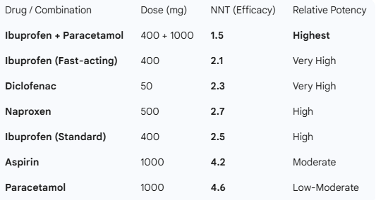 Interestingly, when discussing acute pain (such as a toothache or a sprain), the Cochrane review¹ reveals a surprising fact: the combination of Ibuprofen + Paracetamol is more potent than almost any NSAID alone. This synergy achieves a very low "Number Needed to Treat" (NNT), meaning it is extremely reliable¹.