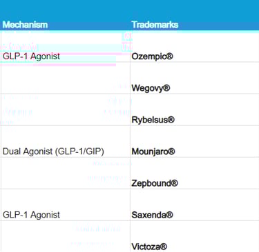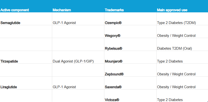It's common to get confused with the commercial names. Here is a quick guide to distinguish them based on their active ingredient and regulatory approval (FDA/EMA), as dosages and devices vary depending on whether the goal is to treat diabetes or obesity²´³: