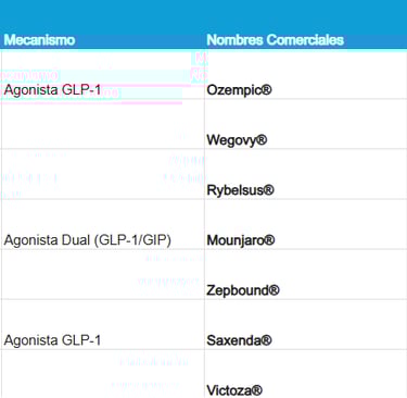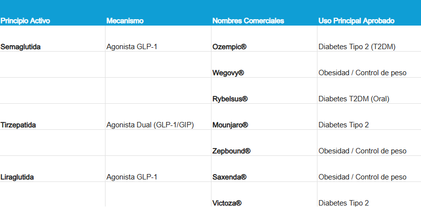 Es común confundirse con los nombres comerciales. Aquí tienes una guía rápida para distinguirlos según su principio activo y su aprobación regulatoria (FDA/EMA), ya que las dosis y dispositivos varían según si el objetivo es tratar la diabetes o la obesidad²´³: