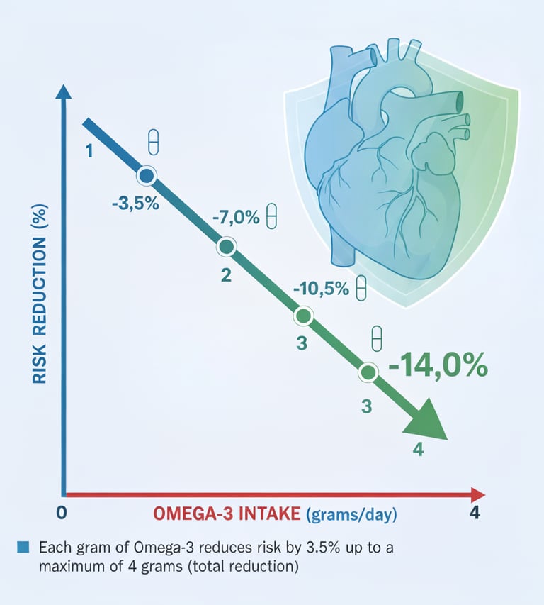 Dose Efetiva: Você não precisa de megadoses para ver resultados. Os benefícios foram observados mesmo com doses de 1 grama por dia de EPA+DHA. Além disso, um dos estudos encontrou uma relação linear: para cada grama diário adicional de ômega-3 (numa faixa de 1 a 4 g/dia), o risco de mortalidade em pacientes com doença cardiovascular diminuía 3,5%.